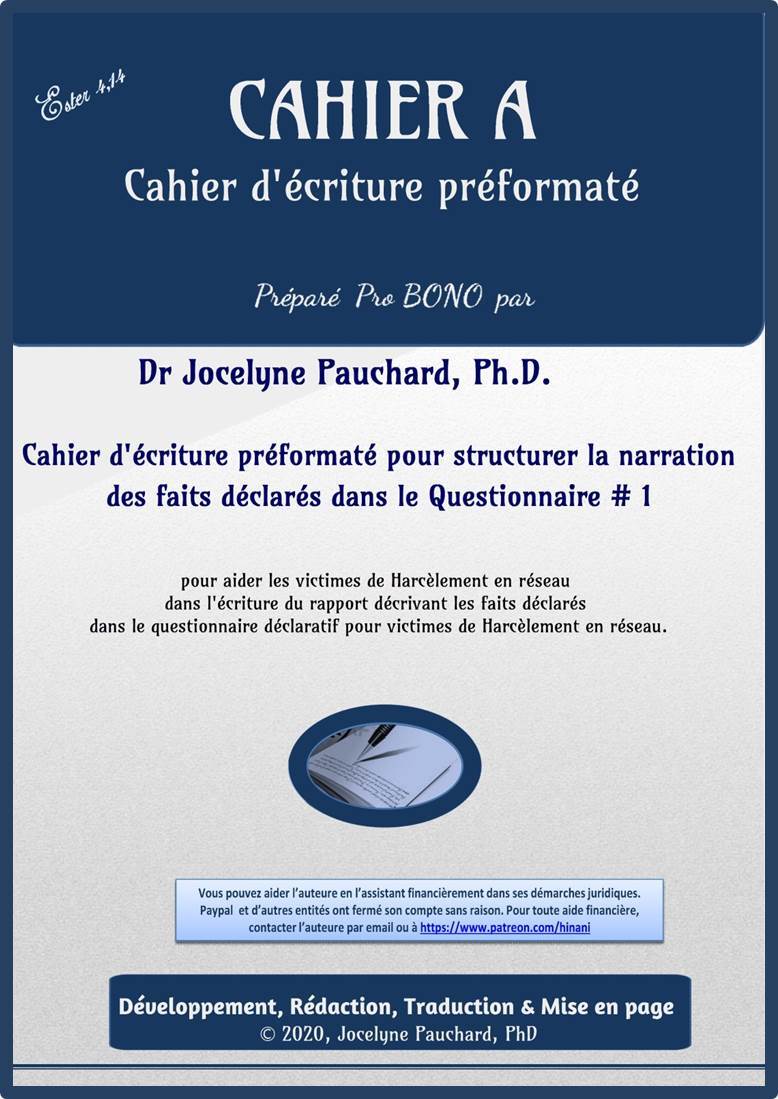 Le Dr Pauchard n'est pas un avocat et ces documents ne sont pas destinés à remplacer des conseils juridiques (si nécessaire, consultez un avocat). Ils visent plutôt à aider les personnes harcelées à mettre de l’ordre dans leurs idées en décrivant les faits de façon chronologique et circonstanciée; l’objectif peut être personnel (mieux comprendre ce qui nous arrive) ou de préparer un entretien avec un professionnel (avocat, médecin, psychologue ou travailleur social). Ce cahier est une aide à la rédaction d'un rapport basé sur des éléments factuels pertinents et organisés de manière ordonnée et significative.